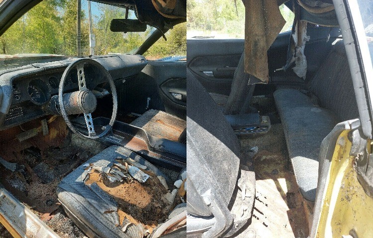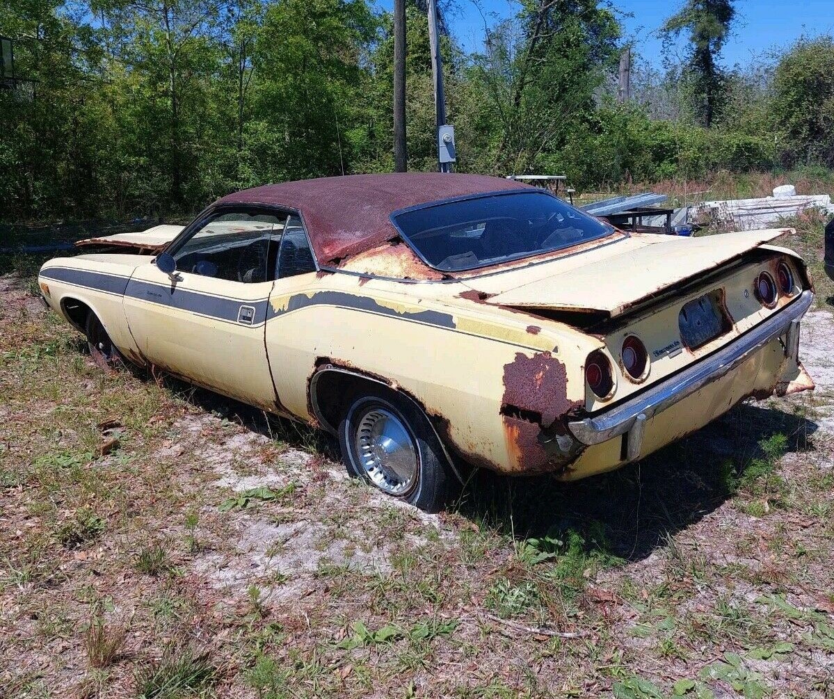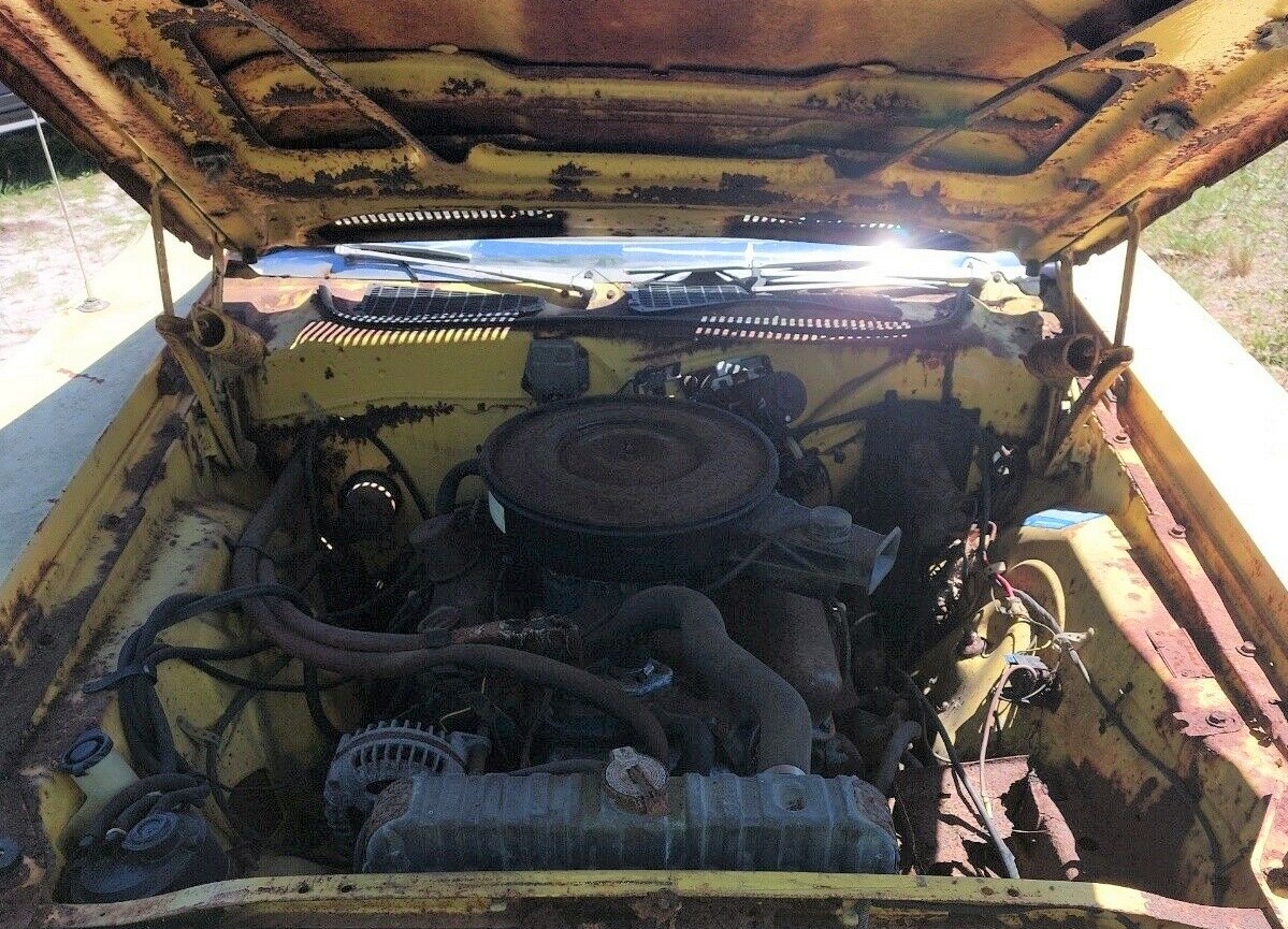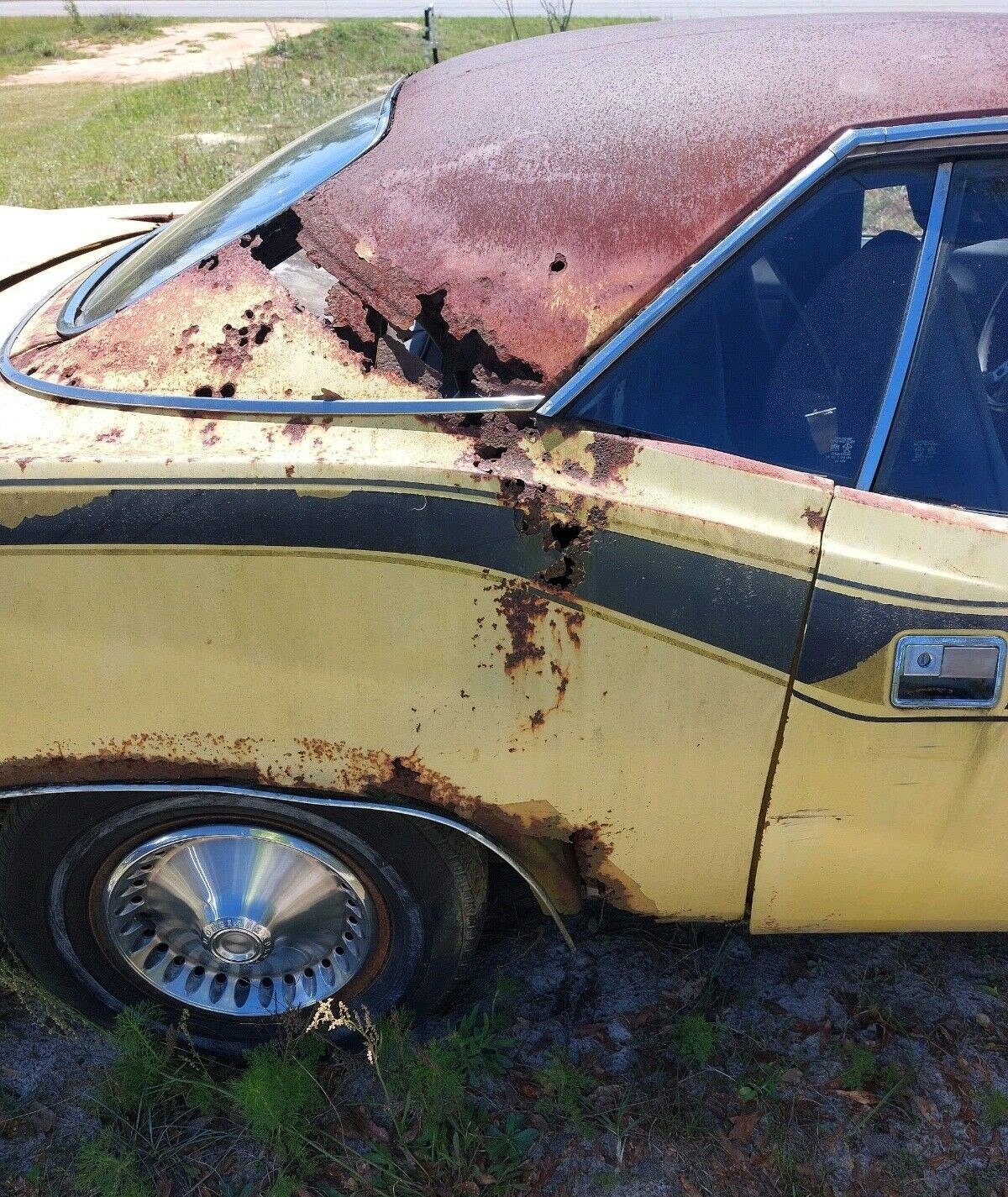 There’s probably a story with this ’72 Barracuda, but we don’t know what it is. With 30,000 miles on the odometer (or 130,000), the car appears to have been sitting in a field or yard for quite some time witness all the rust that it has attracted. Most of the sheet metal is corroded, including big holes in the quarter panels and the roof, which the latter may bring structural integrity into question. The yellow car likely had a black vinyl top at one time, leading to some of those problems once gremlins got below the fabric.