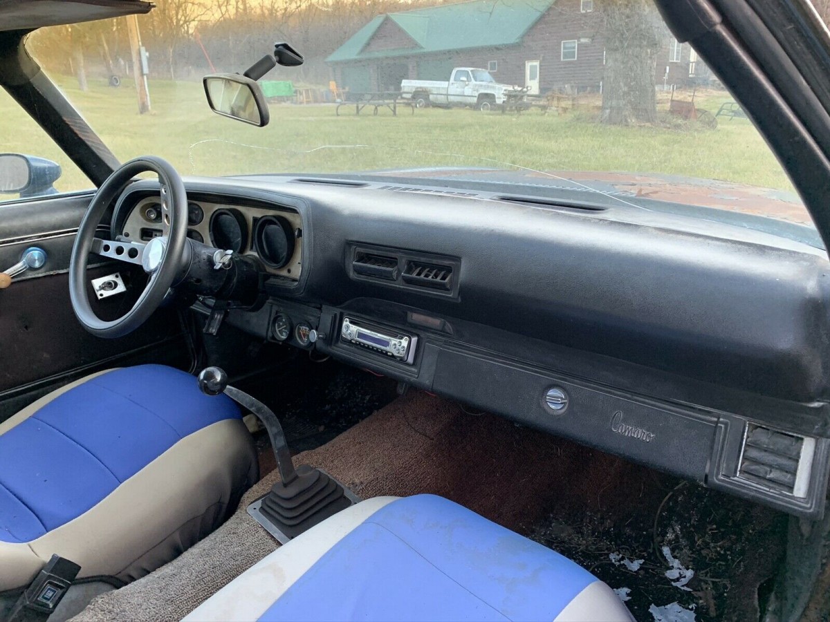 You could say that this car is dug in or sunk into the field below it. With the grill gone and the paint falling off due to the rust behind it, the car has obviously been parked and left to the elements. The seller states that the car has been sitting for approximately 12 years. A 350 cubic inch V8 crate engine sits under the hood of the 1976 Camaro. There is no additional information about the motor or drive train other than the interior pictures indicate that the car has a manual transmission.