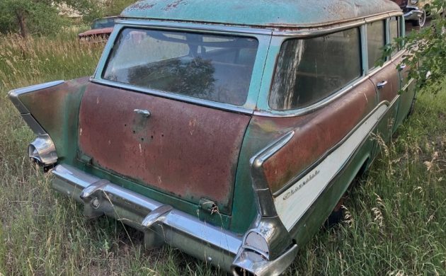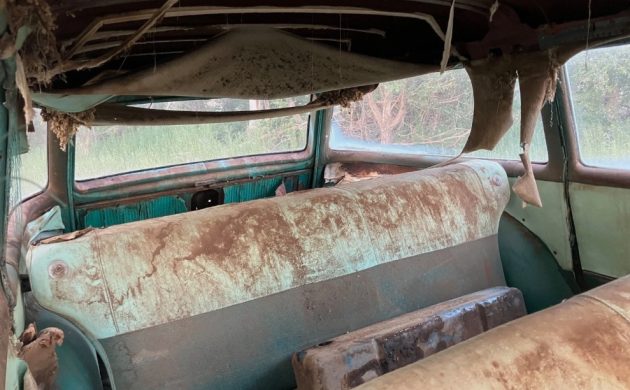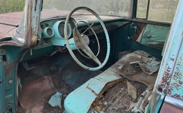 Details on this Chevy are few, and its history isn’t known. It does have a 2-speed Powerglide automatic transmission whose condition isn’t mentioned. The body seems to be surprisingly in good shape per the seller and his/her photos. The chrome seems okay, at least what is left of it after resting for ages. The interior is a mess, as you might expect, and all of the glass is okay, sans one panel.