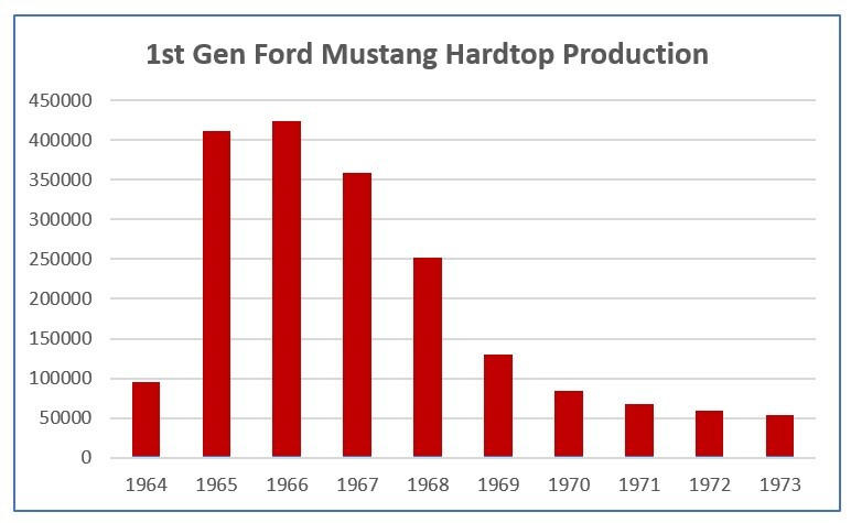 The seller has only provided one photo and tells us the colors run the gamut as do engines and transmissions. The good news is that they all have titles and parts for restoration projects are not hard to come by. Included in the bunch is a 1966 Spring Special, but no details are provided. Everyone remembers how the Mustang took the market by storm in 1964 (the so-called 1964 ½ which was really a 1965). But as the competition came along and market tastes changed, the fortunes of the Mustang went downhill quickly. Here’s a chart of the production numbers for all first-gen Mustangs through 1973. You could see that the Mustang II was coming.