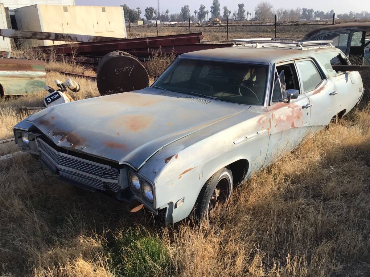 1969 Buick Skylark Wagon: missing front bumper, back window broken out, NOT a Sport Wagon