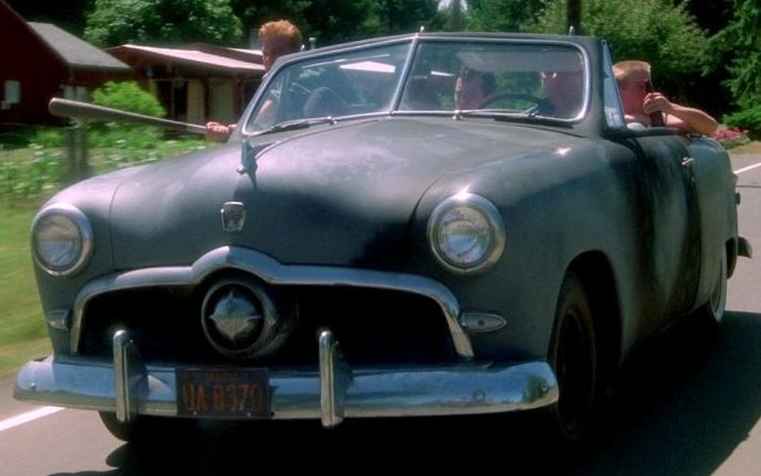 The “Stand By Me” car also has the new-for-1950 Ford emblem above the grill, but it has 1949 parking lights. In1950 the parking lights moved down below this location – as seen on the for-sale car. Those emblems were very popular with 10 year-old aspiring vandals. Simply glued on, they would pop off very easily with a moderately swift application of one’s heel. Don’t ask me how I know. I suspect a good many ’49 Ford owners were similarly attracted so the emblem might have replaced the ’49 “F O R D” letters in the same location over the bull’s eye. Or maybe the movie car had a ’50 Ford hood?