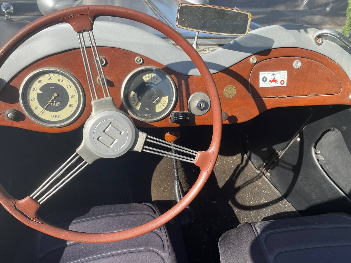 Left-hand drive marks this as one of the few Singers made for export. Just over 2200 of these made it to our shores. While billed as a sporting car, the lack of a tachometer is slightly disappointing. This steering wheel needs repair, but the dash is in good condition. No word on the working condition of the gauges or electricals.