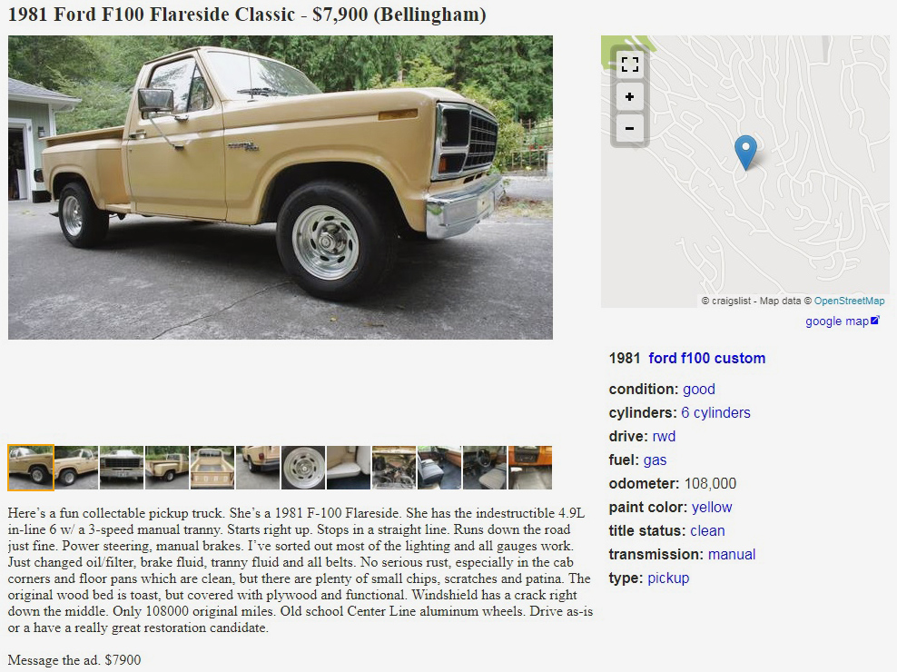 UPDATE – This truck looks great to me. I love the squared-off rear fenders on this Ford Styleside to match the “Bullnose” F-series from this era. We saw this truck back in August when the seller was asking $10,000. The seller has this 1981 Ford F-100 Flareside truck listed for sale again here on craigslist in Bellingham, Washington. They dropped the price to $7,900, and here is the new listing. Will it sell this time? Thanks to Curvette for the tip!