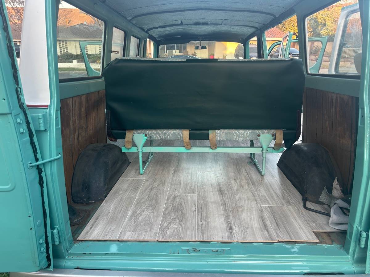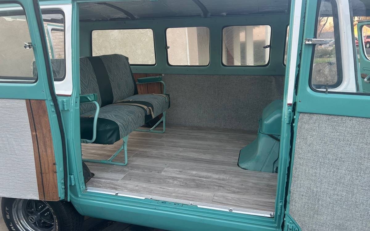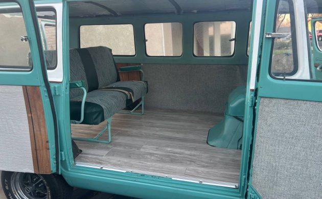 The existing interior is a bit too HGTV for a 60s van. Burnt orange shag carpet would contrast well with the turquoise body color.