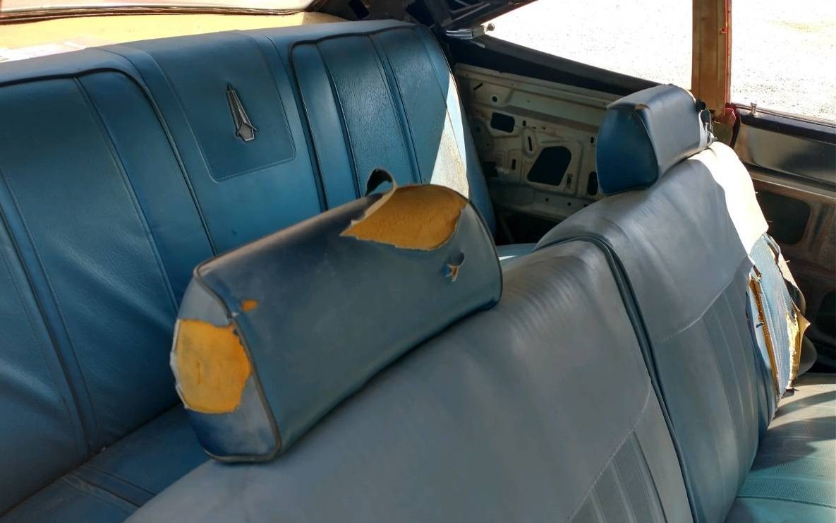 Inside is a pretty standard Road Runner interior, the seller mentions that there is a new dash (dash pad?) and a headliner though the headliner needs some noted additional attention. The instrument panel is a standard spartan affair, minus its radio, but it looks great so maybe the seller does mean the entire dash is new. Other needs will include new carpet and underlay along with replacement door and side panels. Speaking of the carpet, it has been pulled up and shows the bare floors, with some minor surface rust, but the seller claims that this car is a solid one. The original blue vinyl upholstery has seen better days and will require a makeover, hopefully in a different shade.