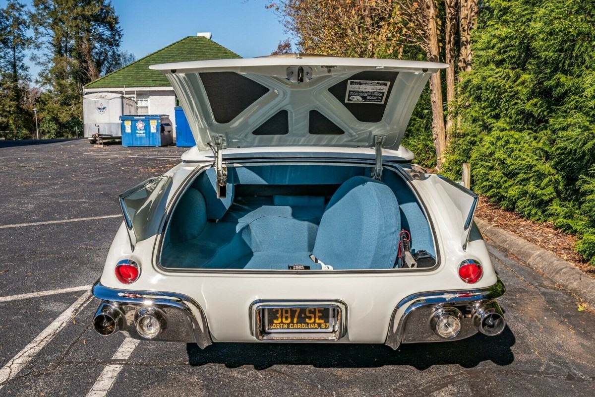 No history is provided about this car other than the beautiful ’57 under went restoration between 2010-14. The exterior is finished in Olympic White while the interior is draped in Sabre Blue with a matching convertible top. It’s one of 1,800 Biarritz drop-tops built that year out of a total of 4,300 Eldorado’s. The car is flanked by chromed 15-inch Sabre-Spoke wheels at all four corners.