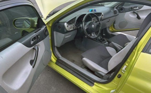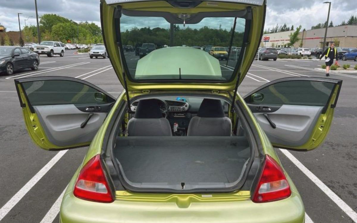 Not only is this car Citrus Yellow (i.e., lime green), which isn’t a big thing to most of you, I’m sure (but it’s a big thing for Insight fans), this car also has a five-speed manual. That’s also a very big thing in the Insight world. I looked at one exactly this spec a couple of years ago, but it was tired, had a few cracks on the plastic front fenders (yes, they’re plastic!), some decent surface rust underneath, and had 250,000 miles. I’ve wanted one for well over a decade, but I’m glad I didn’t get that one. The driver’s seat has some fabric issues that should be fixable without too much trouble, but the rear cargo area looks perfect.