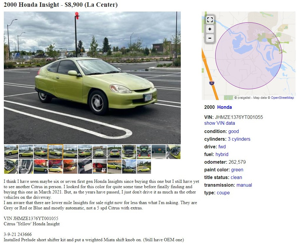 I’ve always thought these were so cool because they were so different looking. And the fact that you can get 80mpg out of them when driven properly to me is amazing. As you may have guessed from my screen name I’m a fan of americas sports cars and have owned 15 of them over my adult life (I’m old, born in ‘54) along with 10 other various muscle cars. But I’ve always daily driven small cars too like mini coopers and GTIs until we bought our first hybrid, a Chevy volt. Plug in hybrids are the way to go for me as we rarely drive more than 40 miles a day and when we do you just go to gas operation for as long as you want. Since the volt we’ve had bmw plug in hybrids and I think they’re great. I saw this Insight on the Seattle Craigslist and sent it to barn finds and am going to try and go look at it. Great write up Scotty.