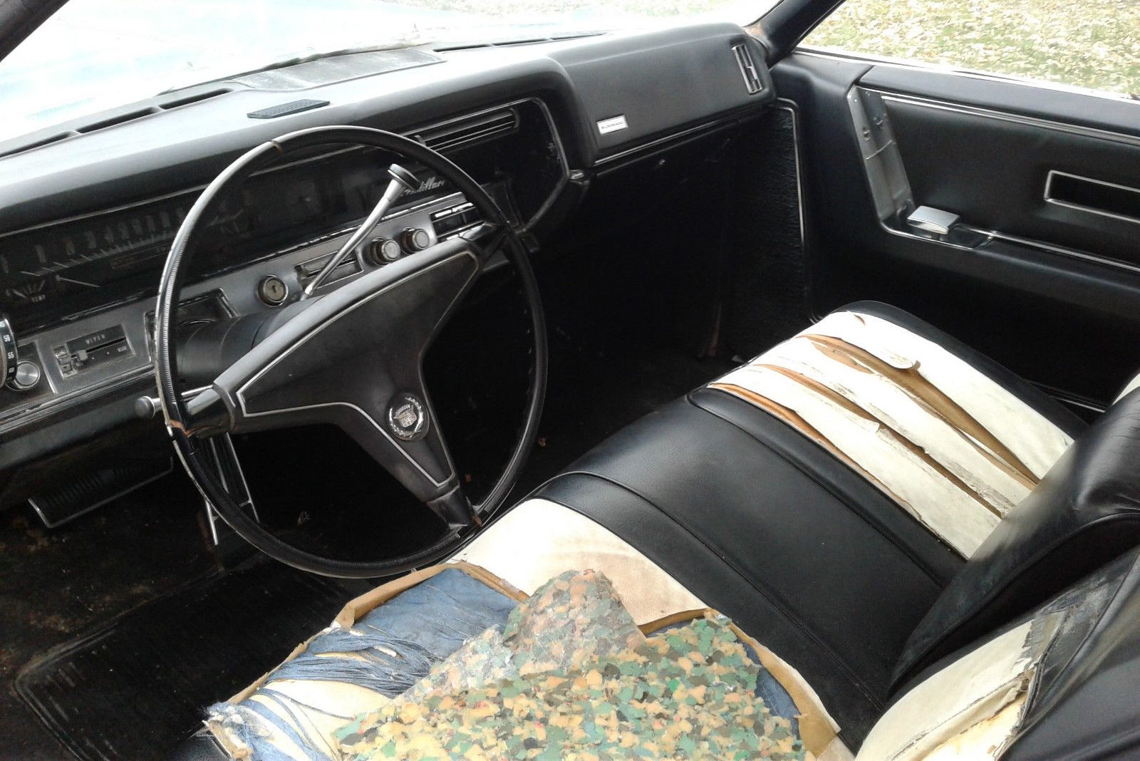 The mileage on this Cadillac is listed as 47,780 but based on the condition of the seats I’m going to assume its 147,780. This car has definitely seen a lot of use, and has been well-loved! However the rest of the interior, such as the door panels, armrests, etc. are all in excellent condition. The dash appears to be in surprisingly good condition, considering the car is located in Kansas and likely has been for some time. The steering wheel is showing some wear, but the emblem placement on the center pad really stands out to me. The gauge cluster is very 1967, but I have to say that the rest of the interior is much more modern. When new, this would’ve been quite the car to own!