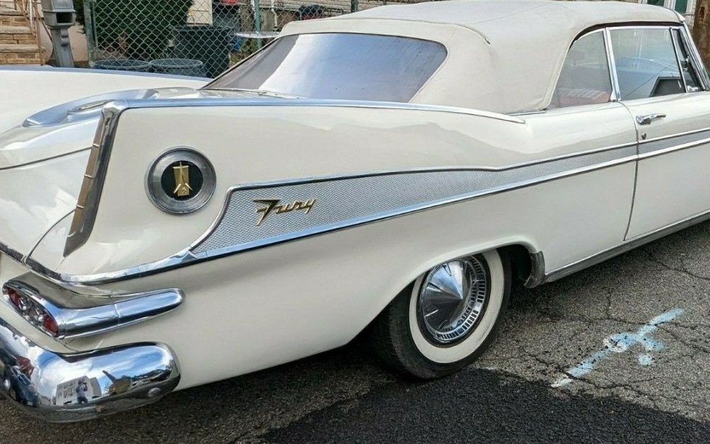 The paint is claimed to be in very good shape and it, as well as the extensive Sport Fury trim, shows quite well. No word if the finish is original, and that’s probably unlikely considering its depth and sheen. The mileage is recorded as 2,502, but certainly not claimed as genuine, so I’d run with the assumption that the odometer has been once around. The seller adds, “The power white convertible top and rear window are in excellent condition“. I would concur with that assessment based on the visually provided evidence. While being somewhat facetious about the twin tail, it certainly makes an obvious statement but not in the overpowering way that a ’59 Cadillac’s rear wings clamor for attention. Really, the only thing that is an exterior turn-off, from my perspective, is that ridiculous toilet seat thingee on the trunk lid.