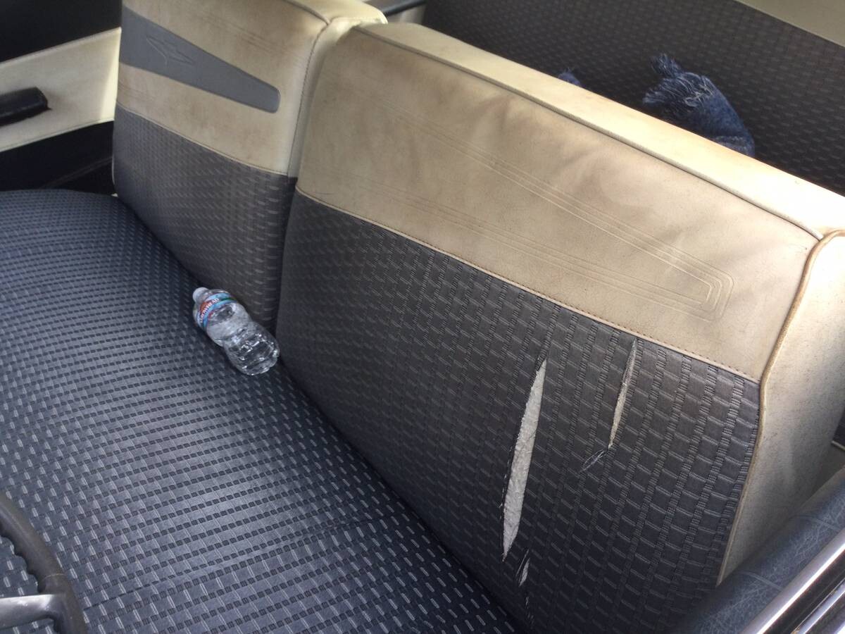 The upholstery is a stark contrast to the three tone Naugahyde in my brothers ’59 Bonneville (which he sold fifty years ago). I would clean the vinyl upholstery with a wet sponge, and some baking soda.Then take it to a professional upholsterer to replace the old grey fabric. If the floor pans are solid, have some front seat belts installed, and call it a day.