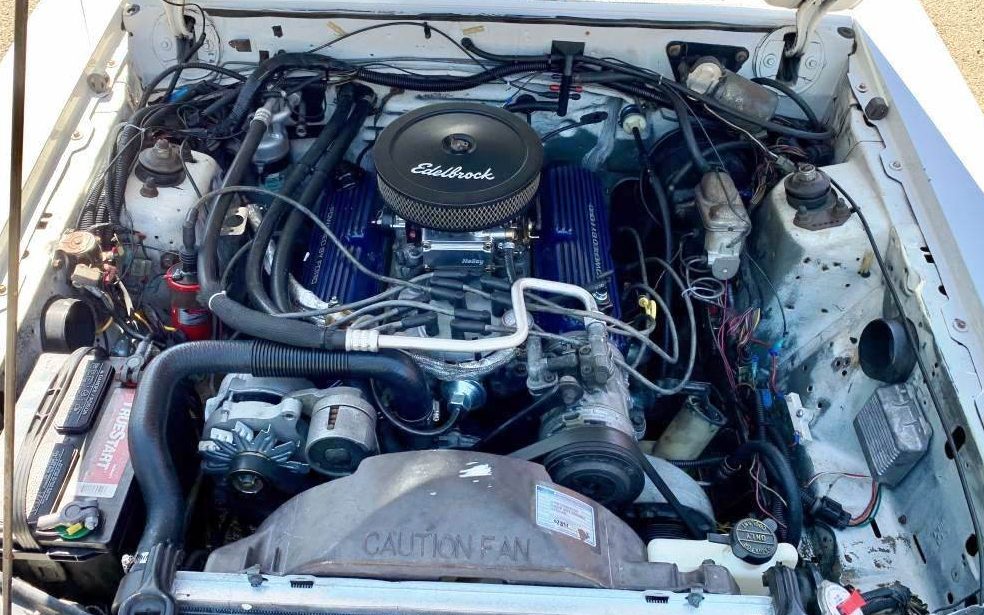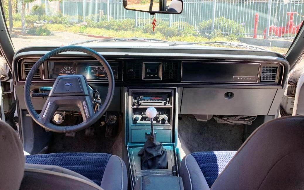 The engine compartment is the same as countless Fox Mustangs made from 1979 through 1993, and a little research will net you plans and examples holding nearly every engine Ford ever made, plus some with laptop-tuned GM LS mills. The seller kindly shows some of the car’s weak points including non-functional air conditioning, but the car does pass California smog testing, always a plus for enthusiasts in the Golden State. Maybe it’s just me, but that empty spot at the front left seems to be crying out for a basketball-sized turbo. Would you guess this boxy LTD runs a warmed-up 5.0 V8 with a five-speed stick?