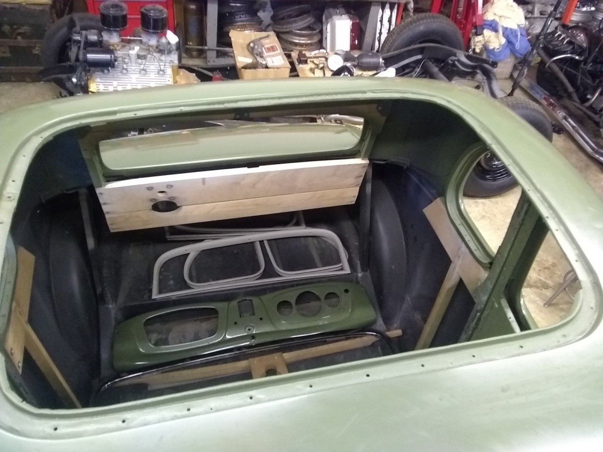 As we look down into the interior, we see that the wood framework has been replaced in this old Ford. We can also see the chrome windshield frame and windshield, the dash, and the garnish moldings. There is no sign of the seat frames or springs, but the windows roll up and down in the doors.