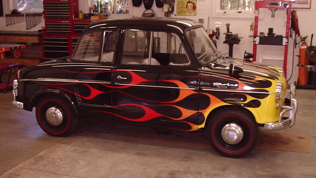 It looks as if the flames were painted on to tell which end was the front and which was the rear! If not for the flames you couldn’t tell which end was what! Cute car tho, not much bigger than a go-cart!