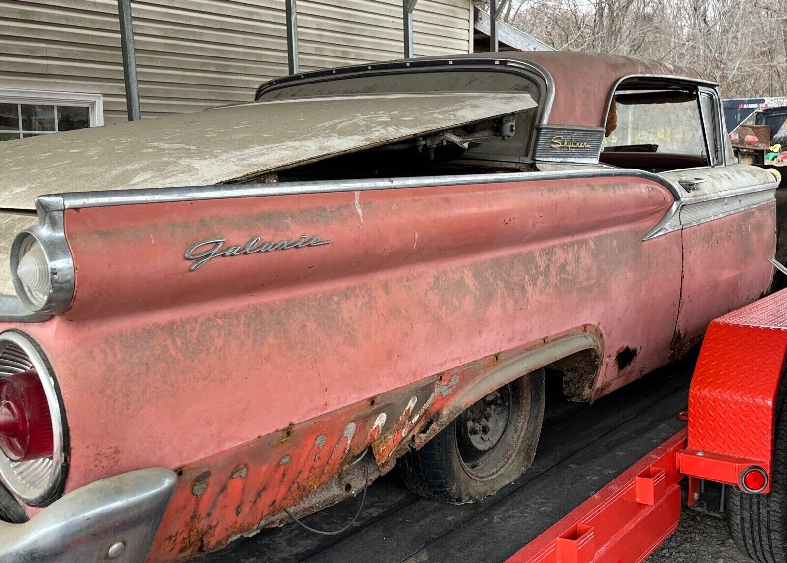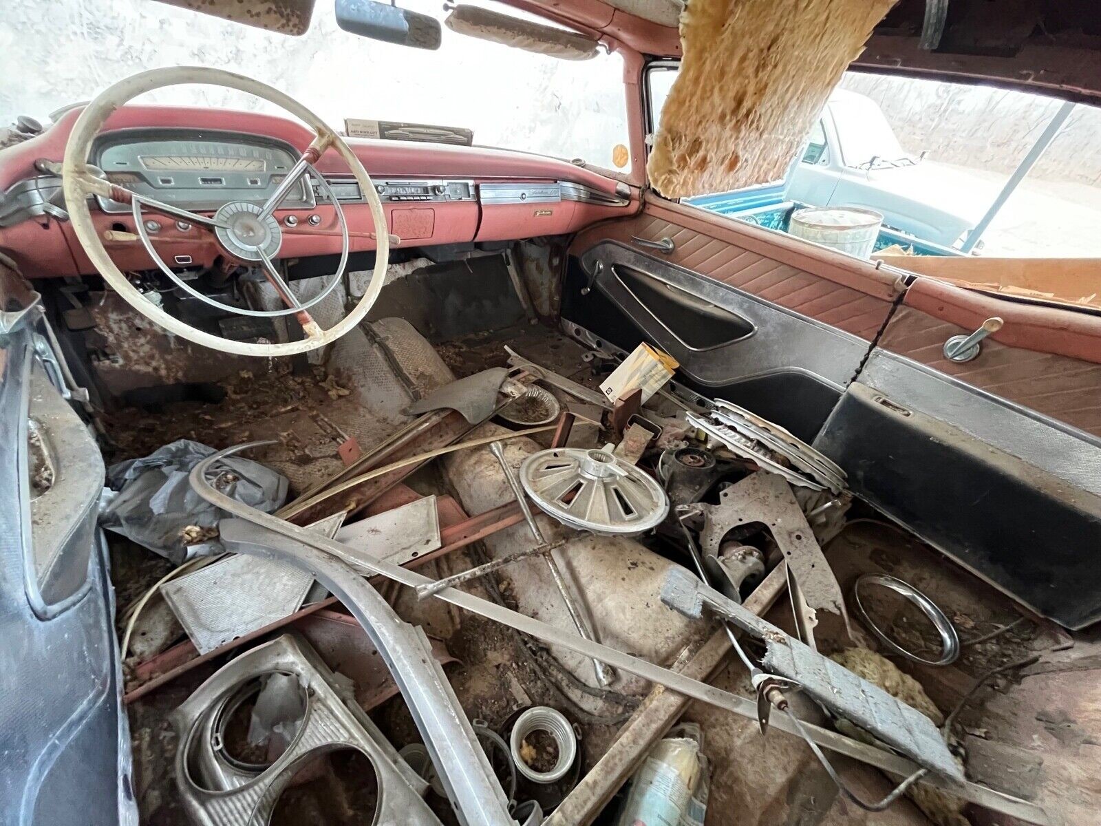 From the looks of things, this pink and white Ford has been off the road for many years. Perhaps that was due to an accident as part of the front clip is missing although those pieces may be in the assortment that comes separately with the car. The odometer is approaching 100,000 miles, which also suggests a mechanical malady occurred with the 352 cubic inch V8 or automatic transmission. In any event, the Skyliner will need restoring from head to toe.