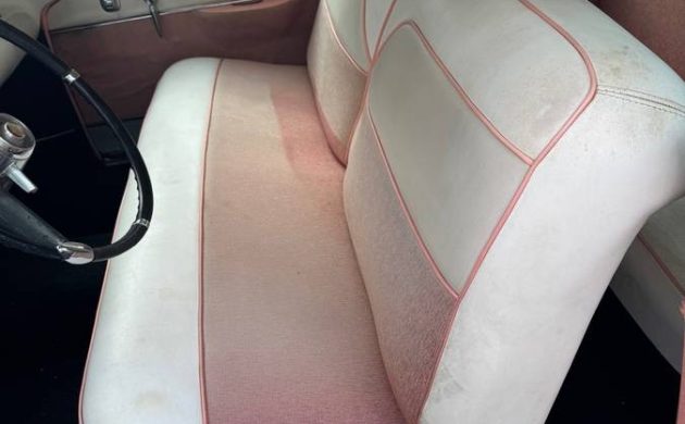 So, what goes with a pink and white exterior? Why a pink and white interior, of course! The entire inside is not comprehensively photographed, but what’s presented looks fair. The upholstery shows some discoloration and wear, but nothing major. The black carpet, however, looks like it may be newish. The instrument panel is a rather basic affair, while the gauges show as being clear and legible. The steering wheel horn ring (remember those?) is broken, but that’s a common problem with cars of this era (my father took out a bunch in his ’68 Mercury Monterey).