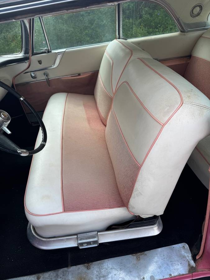 So, what goes with a pink and white exterior? Why a pink and white interior, of course! The entire inside is not comprehensively photographed, but what’s presented looks fair. The upholstery shows some discoloration and wear, but nothing major. The black carpet, however, looks like it may be newish. The instrument panel is a rather basic affair, while the gauges show as being clear and legible. The steering wheel horn ring (remember those?) is broken, but that’s a common problem with cars of this era (my father took out a bunch in his ’68 Mercury Monterey).