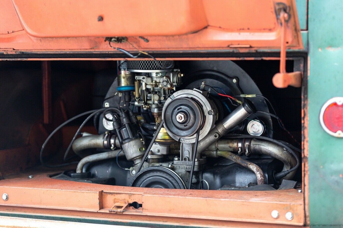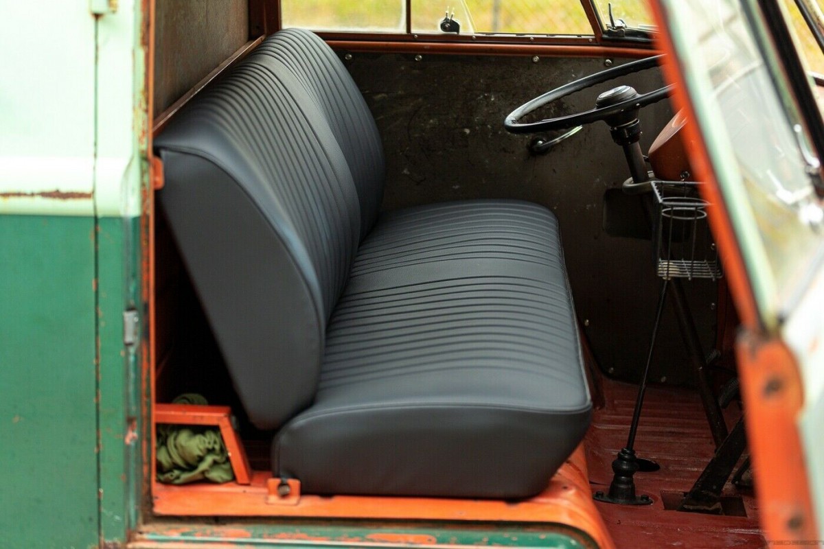 The seller points out that the Dittmers (whoever they were/are) made some choices when building their Bus that Type 2 enthusiasts today now crave. These include high hinges on the doors, high-mount tail lights, and pressed bumpers. They also chose to cover up its original coat of Sealing Wax Red paint, which still pokes through the original paint and is clearly visible on the reverse side of the two-tone green-painted panels. As you can see, the builder chose to make select upgrades to enhance both the comfort and driveability of the Bus, such as the recovered bench seat and dual Safari pop-out front windows.