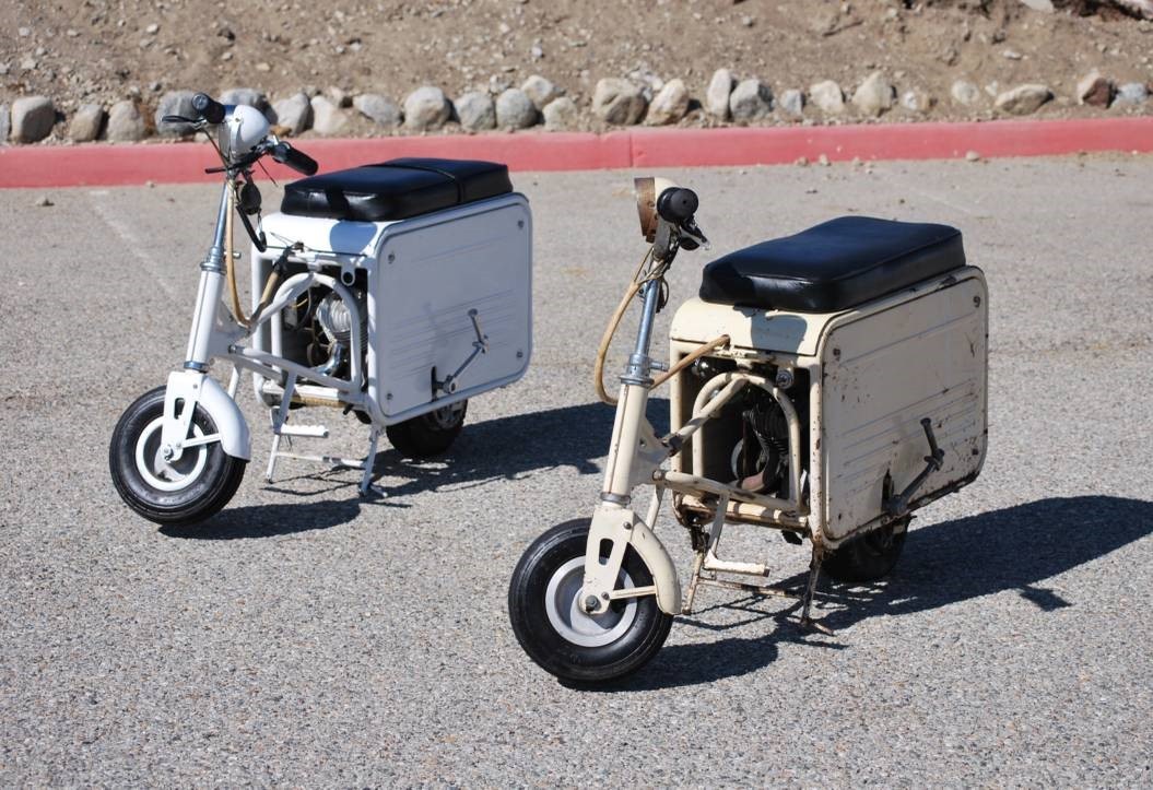 When the scooter was not in use, it could be packed away in its self-contained suitcase and unfolding simply required one to lift up the seat, take out the handlebars, cross-member, and front wheel, and put it all together without tools. Supposedly this could be done in 30 seconds, but that probably was after getting good at it! The little scooters weighed just 75 pounds, so it was easy enough for most people to deal with. The seller has two of these scoots for sale, both from 1960; one is in original condition, while the other is an older restoration. Neither is running at the moment, but they both kick over. A set of decals is provided for each which were probably not put on from the beginning. Once you get them going, they should be able to go 35 mph (on teeny, tiny wheels).