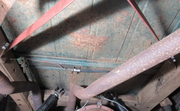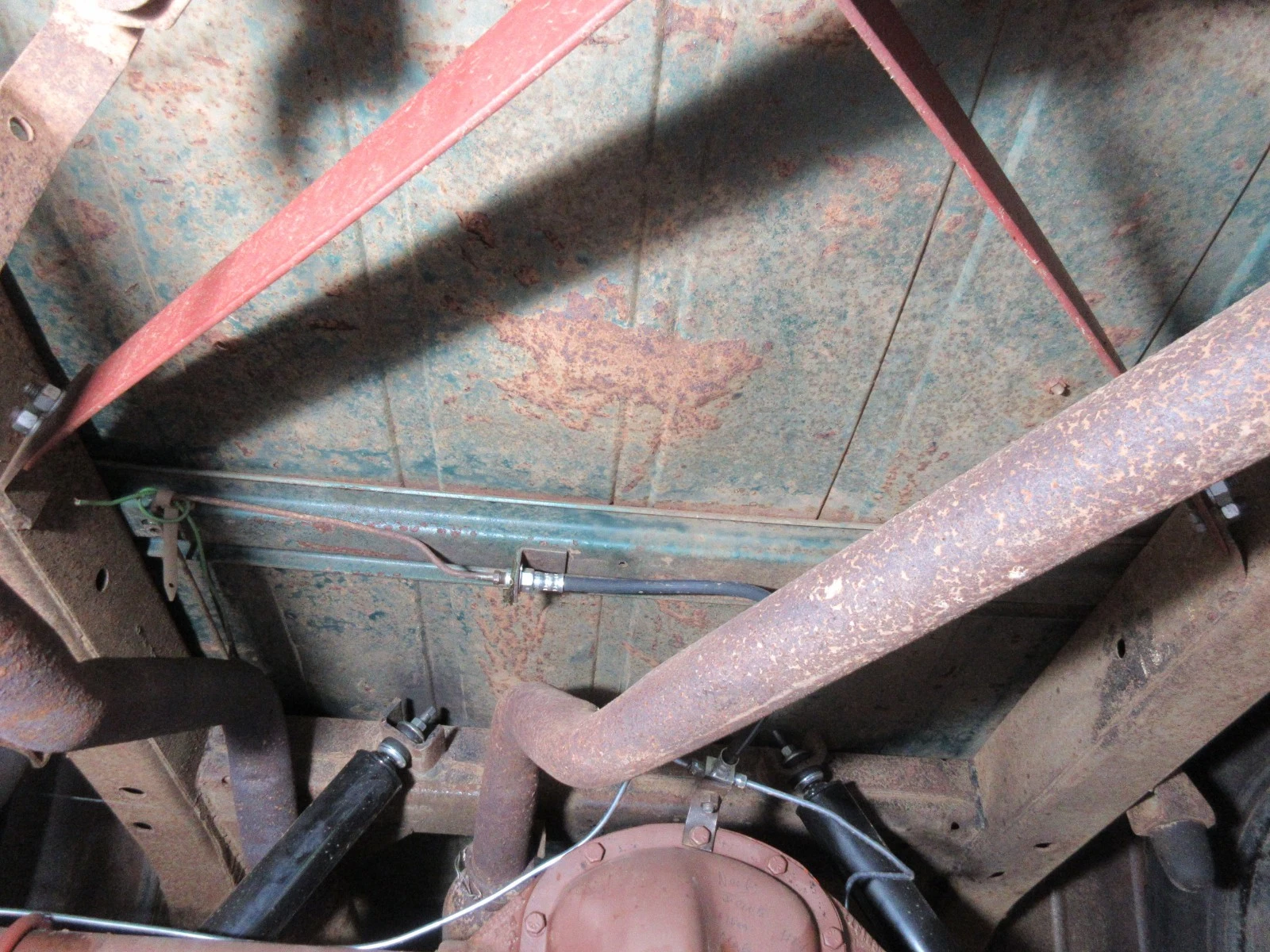The seller includes several undercarriage pictures, and the only serious rust on the whole truck appears to be a couple pinholes in the rear quarter on the passenger side. As you can see with the hoses and lines, the brakes appear to have been serviced at some point in the more recent past, and the master cylinder and rear shoes are new. The exhaust system is rusted and will have to be replaced.