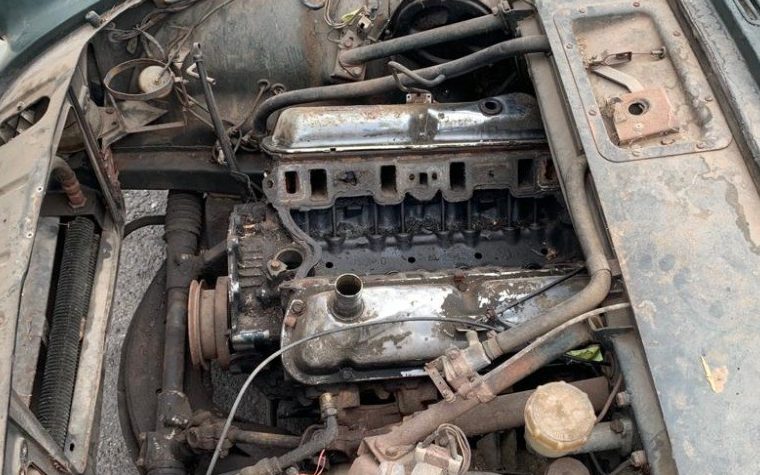 The exterior of this Tiger has a road-weary look about it, faded paint, faded chrome and a bent grille. But it’s green and I like it! The body is straight with no dents or obvious mishaps, as stated by the seller; there is no reference to underside rot or corrosion however, something for further review. The slope and shape of the removable hardtop, IMHO, fit the design dynamics of the body perfectly. The seller does advise that a folding, fabric top is included, no word on its condition.