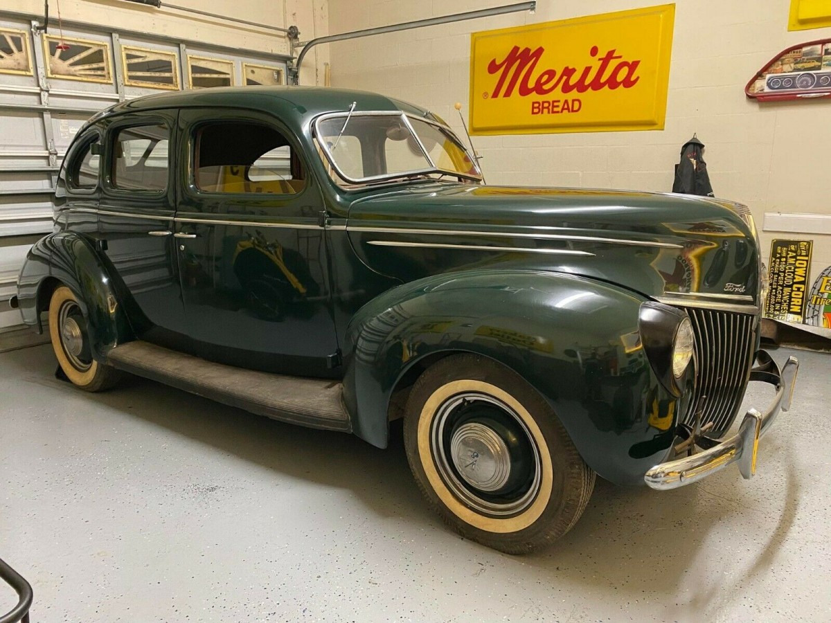 Ford introduced its more upscale DeLuxe line in 1938 to try and bridge the gap between its Standard base model and the luxury Lincoln line. (But it wasn’t just a trim line difference, the two lines differ in appearance.) This featured 1939 DeLuxe Fordor Sedan (that’s not a typo, that was Ford’s clever way of spelling four door) was one of five DeLuxe models that year which also included a Tudor Sedan, Coupe, Convertible Coupe, and the last year for the Four-Door Convertible Sedan. It appears to be finished in Dartmouth Green, one of six colors available on the De Luxe line in 1939. It presents pretty well and shiny in the photos, but the seller shares that the driver quality paint shows wear and rates it a 7 on a 1-to-10 scale.