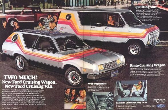Ford had a similar, but less committed, customer in mind when they created the completely cosmetic Cruising packages in 1977 – with twin versions of a standard Ford E-150 Van, and a Pinto Wagon available aimed at the lazy “hip” buyer who wanted the look of custom without the time commitment. Their 1980 ad touts “Forget the time, hassle, and hard work of doing it yourself! Ford did it for you!…From new with-it colors to soft-shag for comfort – to just about every “trick” in the book!”