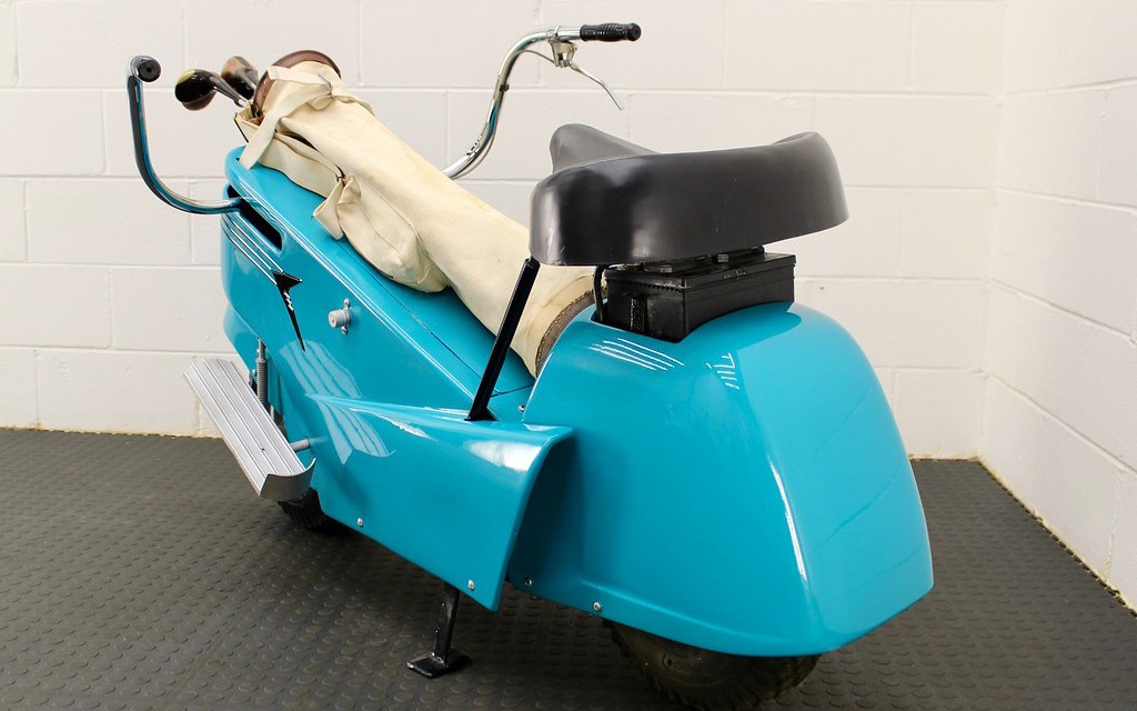 You can see the super complicated controls… Other than having to add gas and checking and/or changing the oil every now and then, this looks like a very easy scooter to operate. According to period advertising, a person could get 72 holes of golf from a gallon of gas. You just stand up and the stand retracts to keep the scooter upright while you swing away, then when you sit down and hit the gas, the stand automatically retracts up into the bottom of the scooter.