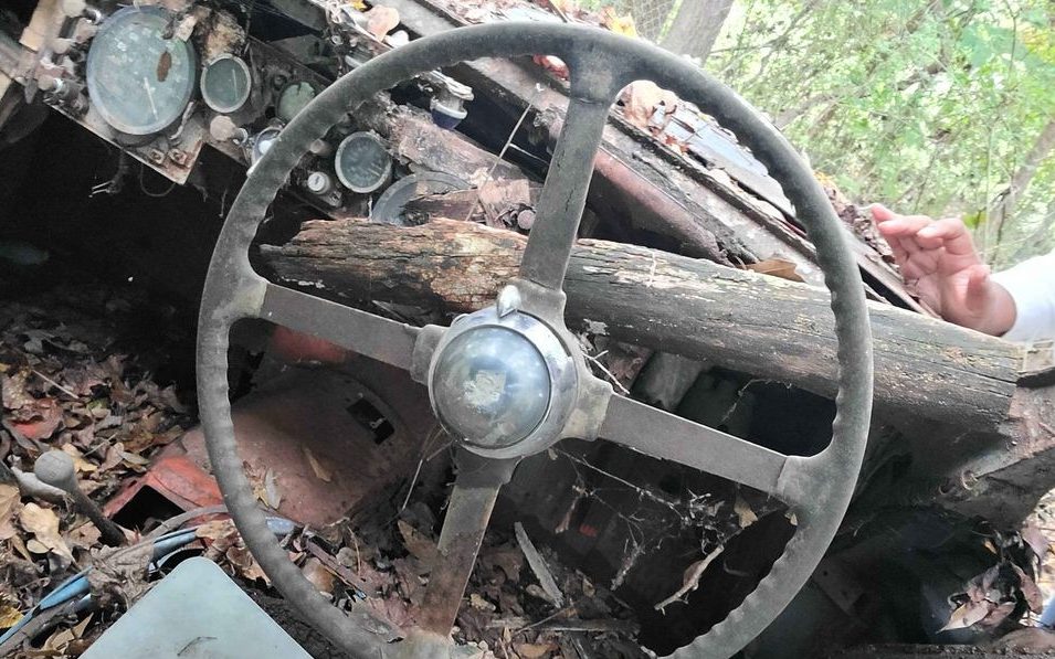 The interior may as well be the exterior considering the amount of foliage that is now residing inside. The entire environment is completely destroyed. I don’t think that I have ever encountered a bigger mess, particularly one where the instrument panel has just rotted away. Other than the back seat and it’s not completely discernable but it’s unlikely that there is anything restorable or of value that remains.