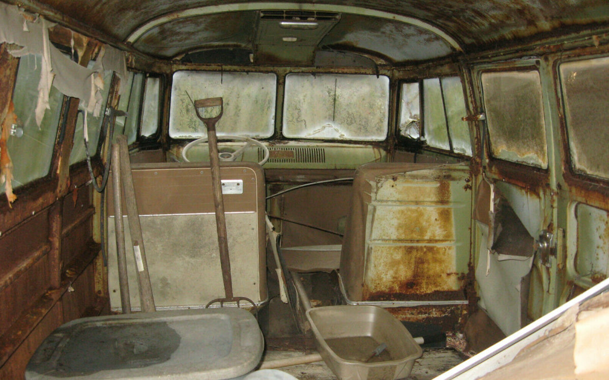Amazingly, it looks like the tires are still holding air although it’s hard to tell for sure. Unfortunately, someone has stripped the big “VW” emblem off the front along with the headlight trim and various other pieces. Hopefully, they will be found inside, but it isn’t likely. I’m not sure if this van is able to be saved or if it’s too far gone? What do you think?
