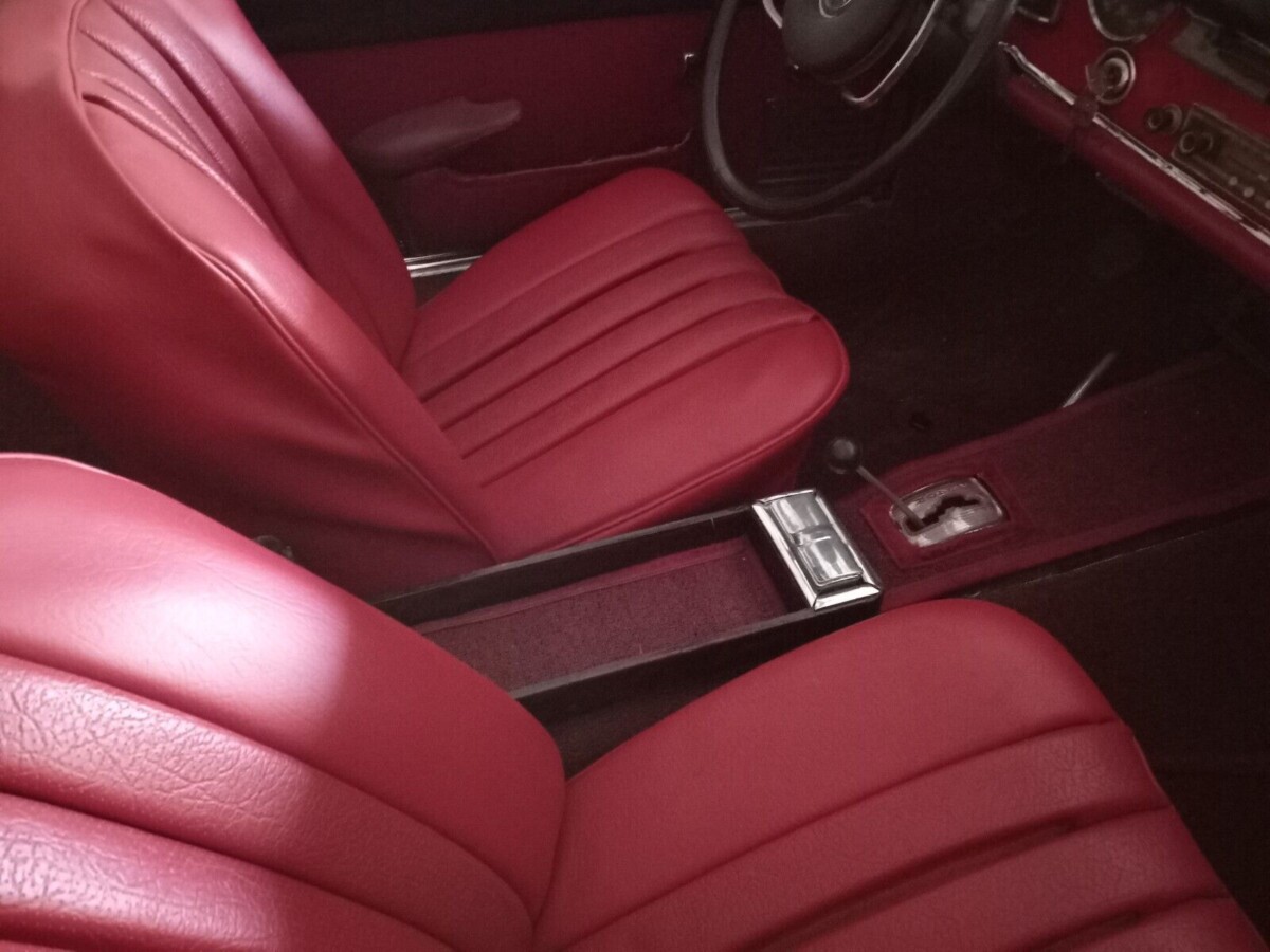 Oftentimes when we find one of these in “as found” condition, it is in horribly rough shape. Rust is a killer on a W113 car that’s been left standing, so it’s fortunate that this one has been stored indoors. The location of Fort Pierce, Florida doesn’t guarantee it has no rust holes underneath, but it stands a better chance of being solid than one found in the Northeast. The color-matched hubcaps are hard top are good to see; the Pininfarina badge on the fenders is harder to unsee.