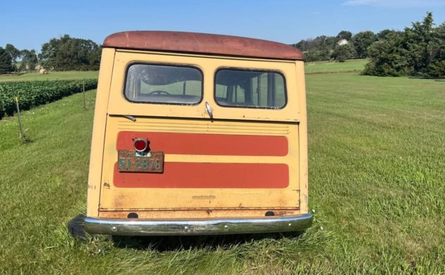 This example wears what’s likely its original brown paint, now thoroughly sun-baked and weather-worn. The steel body features period-correct side and rear woodgrain-style paneling—likely painted steel rather than actual wood, giving it a faux “woody wagon” look. While covered in heavy patina, the body panels appear largely intact with no major rust-through visible in the photos, a good sign for anyone eyeing a restoration.
