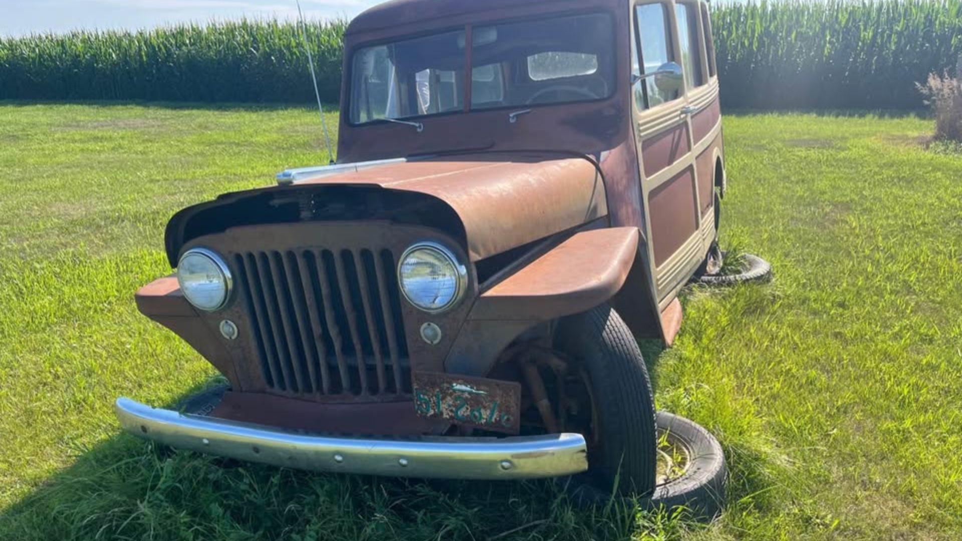 This example wears what’s likely its original brown paint, now thoroughly sun-baked and weather-worn. The steel body features period-correct side and rear woodgrain-style paneling—likely painted steel rather than actual wood, giving it a faux “woody wagon” look. While covered in heavy patina, the body panels appear largely intact with no major rust-through visible in the photos, a good sign for anyone eyeing a restoration.