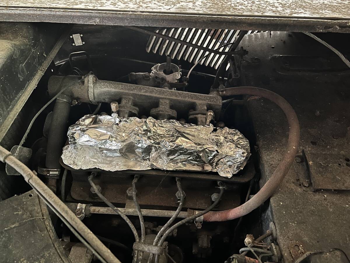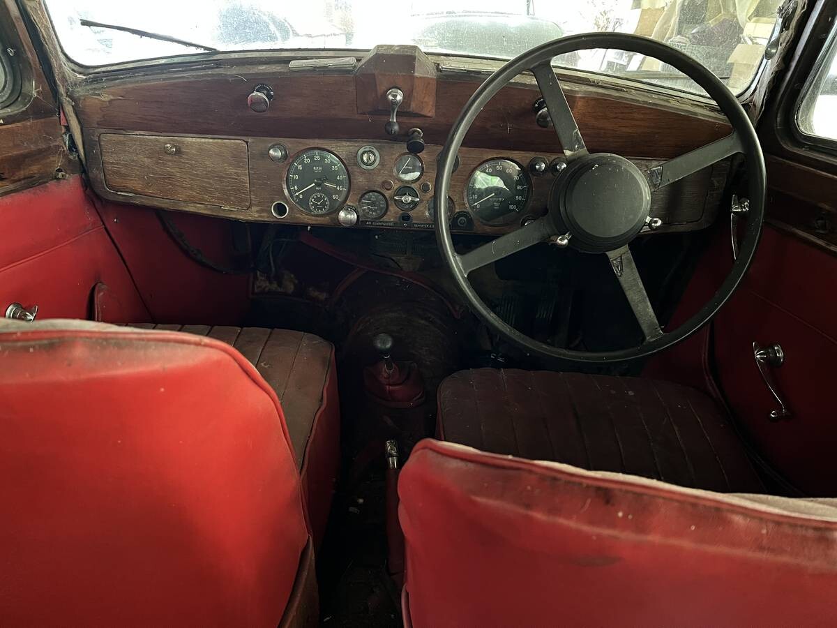 Of the three “Liter” cars, only this one has an unmodified Standard-supplied in-line four-cylinder 1772 cc engine making about 70 hp. The 2 1/2 and 3 1/2 liter cars used Standard in-line six-cylinder engines modified by Harry Weslake to use overhead valves, resulting in a significant power boost. This car should have a Standard-supplied four-speed manual gearbox. Research shows that the larger cars received Moss gearboxes. The seller says this engine turns over and the mechanical Girling brakes do work. The dashpot for the SU carburetor, the air cleaner, and likely the valve cover (replaced by tin foil) are missing. While these smaller Mark IVs were less powerful than their siblings, top speed was still around 75 mph and fuel economy was great for the time, at about 25 mpg.