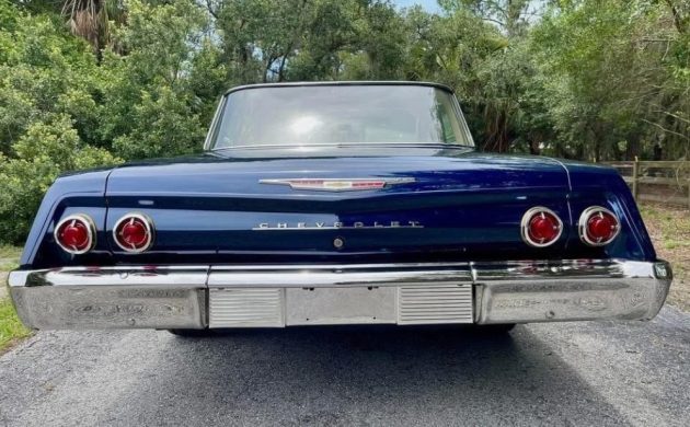 I would say, quite possibly, it was an Oregon State Police car, originally. It would have been a 380-horsepower 409 (RPO 580) with the single 4bbl. I owned a 1965 Ford 2-door Custom 390 Police Interceptor that was an old OSP car. It, too, was a special order Dark Metallic Blue. The paint code on this car is 884 which was a special-order color paint so, it all makes sense.