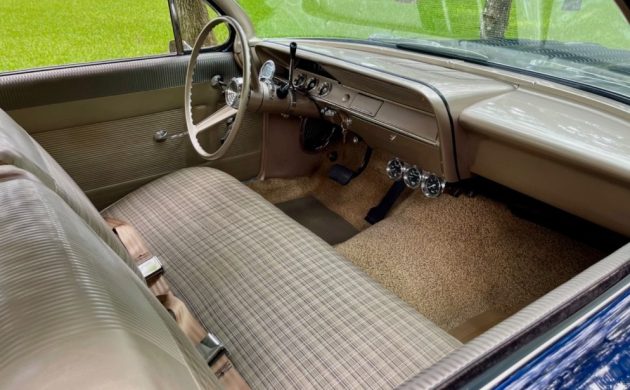 Lots of not original here including engine but since it isn’t a 409 I’m not sure why it would matter. IF the fender tags (V8 insignias) are correct it came with a 327. Big if. It’s also a power steering car. Quite unusual for a 62 Biscayne. If the back story is true was probably a Captain’s car or some such like.