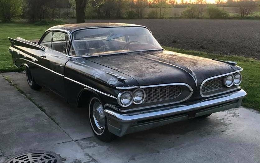 The 59 was the first of the Wide Track series Pontiacs but this example, sadly to say, is a rust bucket. I believe that is a Tri -Power emblem on the fender but has a 4 bbl on the engine. This thing is worth $3000.00 – $3500.00 at best. It appears to have been hit in the front end. If it came from Michigan you can bet it’s real rusty underneath. I would pass.