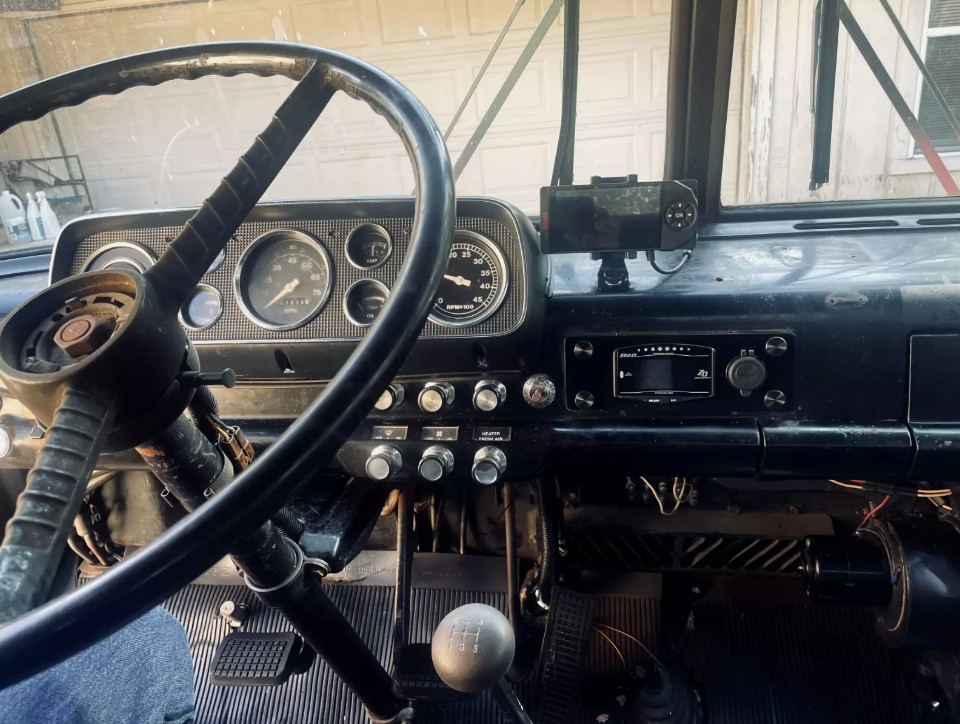 These were miserable trucks to drive especially if you’re tall. I’m 6’2″ and had to slump down in the seat or be hunched over the wheel and if you were short you had to slide over and lean forward to get the crappy shifter into 4th gear. This truck is one of a very few I’ve seen with disc wheels. Hauled hay with a guy that had one with a 534 when a 100gal was $30, it was abandoned quick when the gas crises hit.
