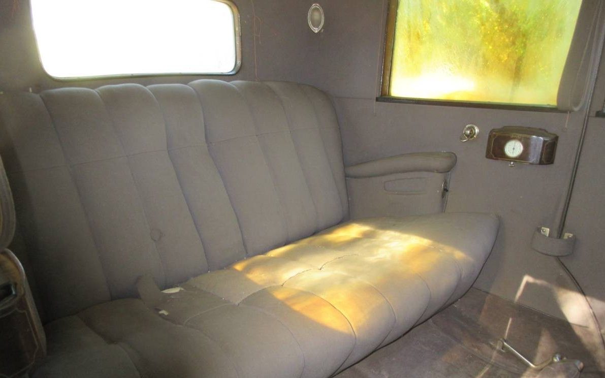 The commodious interior shows well for being 90 years young. There is some age-based discoloration but little wear is evident. Interesting to note is the difference in the fabric hue between the back seat and the jump seat. Assuming that the jump seat has been positioned in a folded closed state for a long time, it looks to be quite a bit brighter than the exposed back seat. Also interesting is the side-mounted rear seat clock which looks to be encased in a mahogany frame, a great luxury touch!