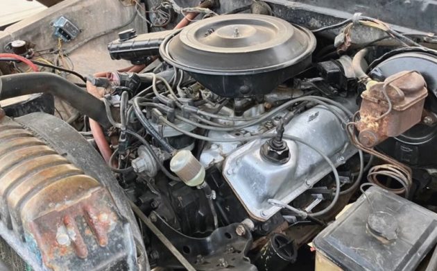 I’m assuming the padded dash top has seen better days, as there’s a pad on it. The hot southwest sun can be harsh on soft things, like fabrics and people. The rest of the interior looks nice from what we can see, with cool patterned fabric seats, a steering wheel that appears uncracked, and fancy faux wood trim. The seller says there’s no scary rust, just a bit of surface or minor rust, and everything is original.