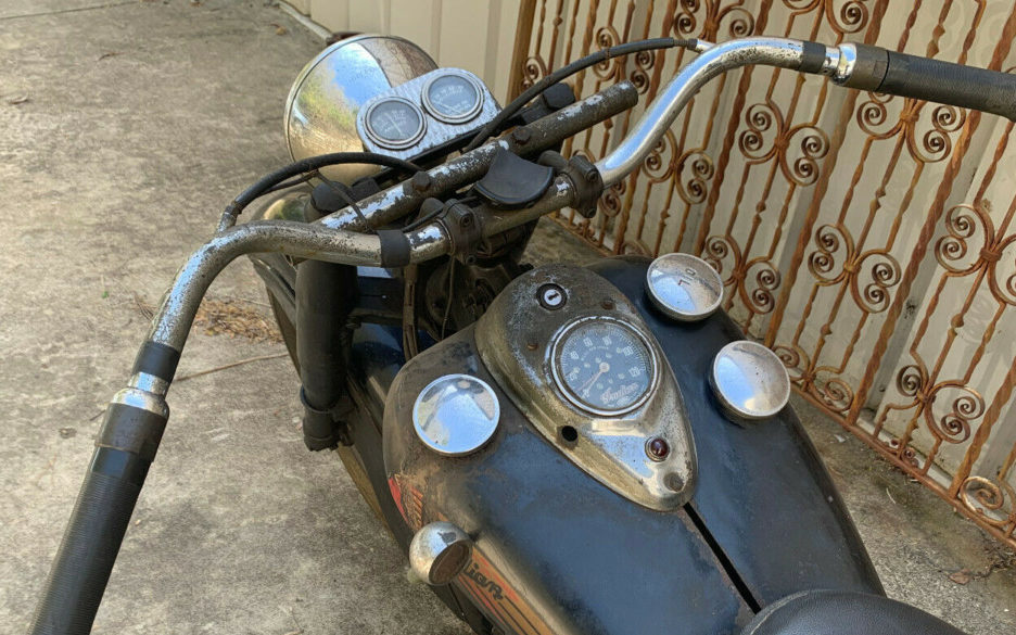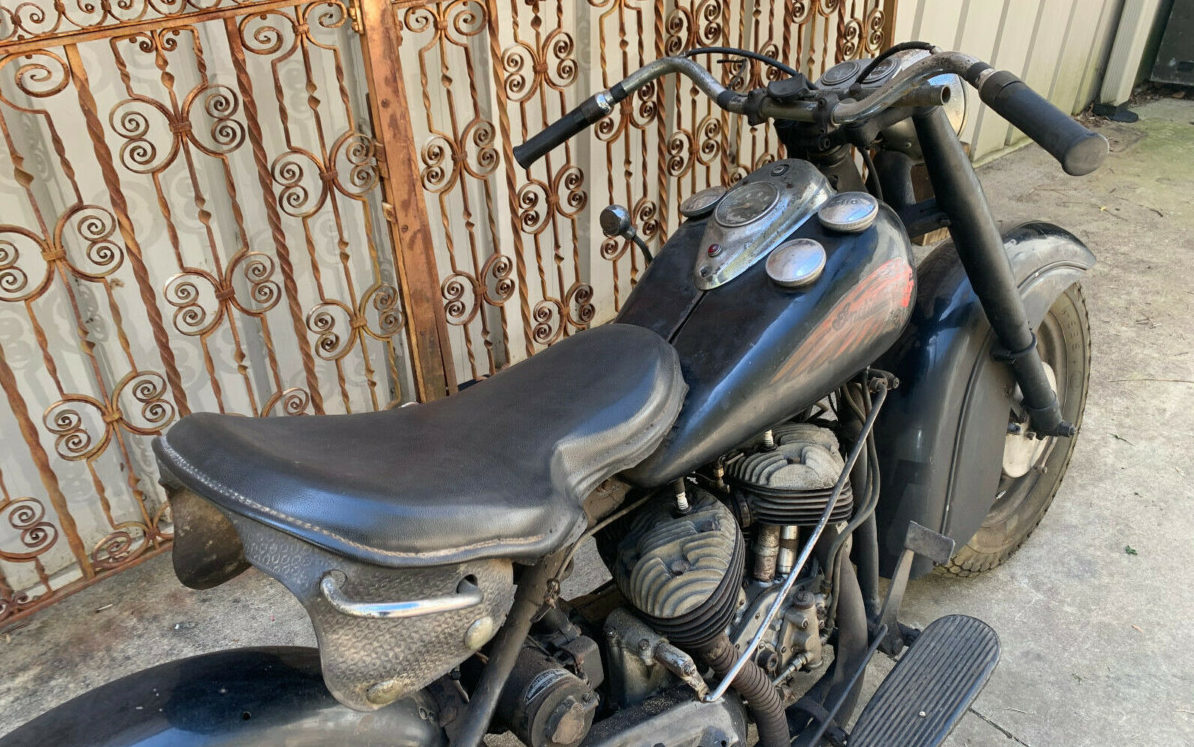 The only enhancement spotted appears to be what are additional gauges mounted on the handlebars above the headlight. They blend in well and it’s hard to go wrong with an added oil pressure gauge. The original Indian speedometer is in place and other than the obvious bezel corrosion it appears as functioning. Even the Indian mascot decals, adorning either side of the fuel tank, are still recognizable.