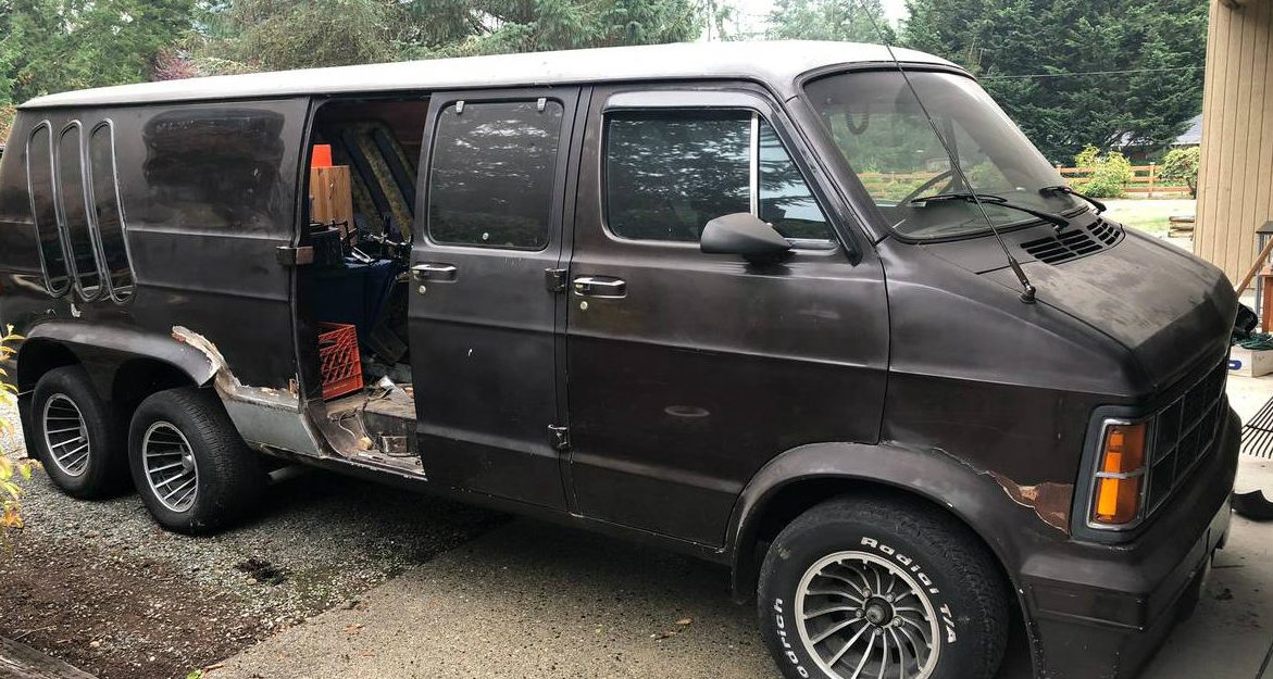 The era of custom van building is one that will hopefully make a return to our culture in the near term. Wild, overdone creations is still a thing in countries like Japan, where vans are overbuilt to the point of absurdity. This 1979 Dodge B20 Tradesman started life as a fairly ordinary worker van but now sports an additional axle and custom trailer. Find it here on craigslist where the seller is demanding buyers send him their best offer over $10K.