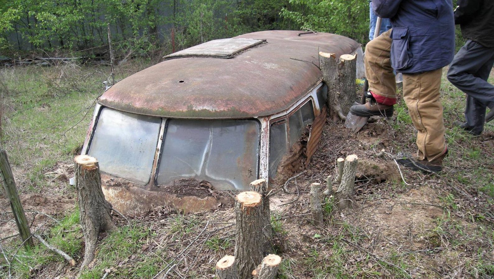 Another subterranean VW bus? When excavating for our pool in Pennsylvania, we were worried about hitting rock, not Fahrvergnügen. Work came to a screeching halt when the backhoe punched through the roof of one of these guys, an early 60’s job that had been napping underground for a few decades. The bad news – it was too far gone to salvage. The good news – nobody was inside the thing.