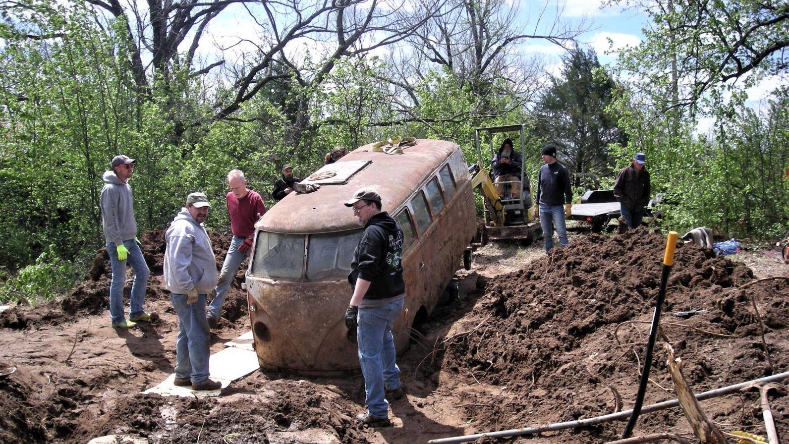 The new owner of the Bus was able to corral several other air-cooled enthusiasts and members of The Samba message board to come and help with the extraction. From cutting down trees to digging out around the VW, many hands made light work despite being buried up to its windows since 1983. The Bus did have its torsion housing removed along with about “two feet” of frame, apparently to make it easier to bury in the soil of Oklahoma deep enough to be transformed into a suitable storm shelter.