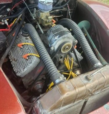 The original 85 hp 221 cu. in. flathead V8 engine has been replaced with a later, larger Mercury V8, backed with a manual transmission. The seller’s father didn’t drive the car much, though it does run well. The frost of corrosion that comes from long storage is evident in the engine bay. The car comes with spare Offy intakes and extra carburetors.