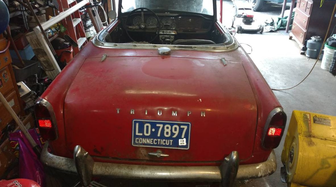 I’m so used to seeing the TR4s sitting on beefy Panasports or otherwise in perfect, updated condition that it’s refreshing to see one as it left the factory, even if it’s sitting on deflated tires mounted on steelies. The chrome is all fairly tired but the taillight lenses look good; as mentioned, the state of Connecticut hasn’t used those plates in a long time. The seller offers no history or otherwise any indication as to why it’s been parked for so long.