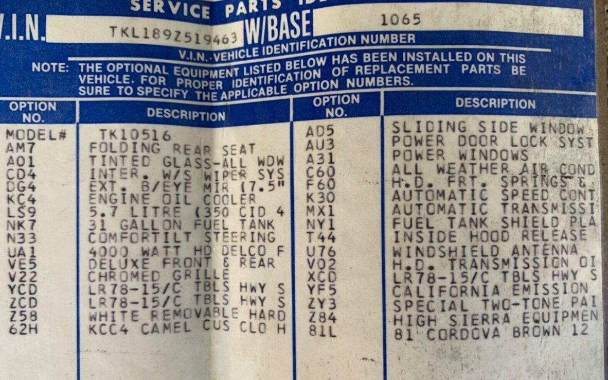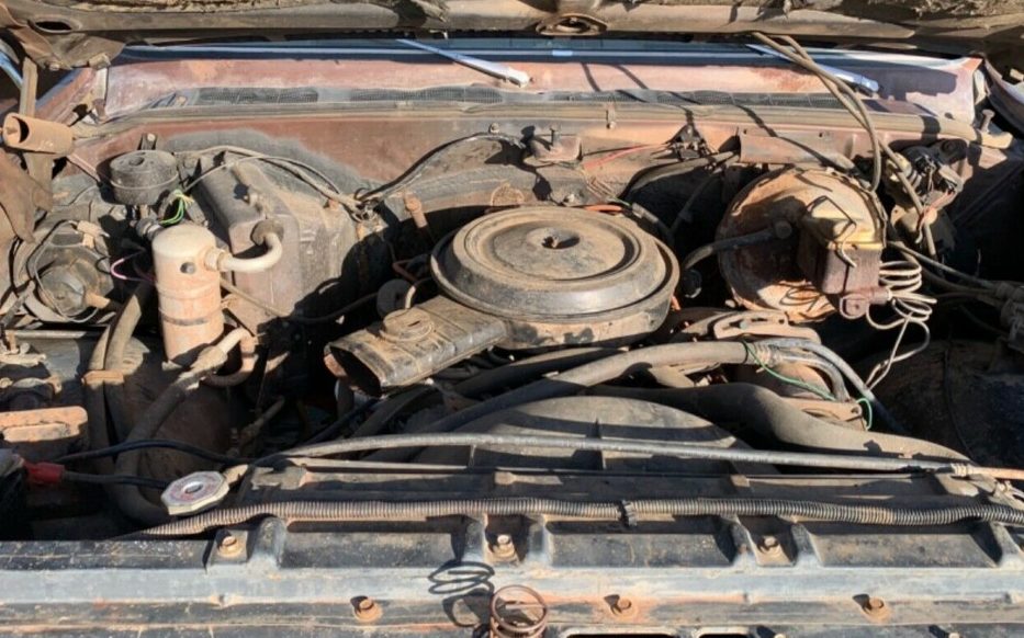 This example is a four-wheel-drive equipped model with “High Sierra” trim which is mostly an upgraded interior carpet/fabric selection, color-keyed mats, map pockets and other finishing touches to the door cards, better body insulators, and additional exterior trim. While we are on the subject of interiors this one looks about how you would expect, it’s worn but not worn out. There are scuffs, scratches and dirt in all of the usual places along with a famously consistent GM quality cracked dash pad. The seat fabric appears to be in good nick, however. The seller states that the gauges and radio work but not the A/C.