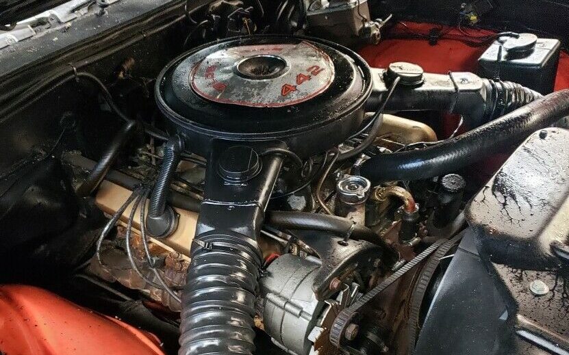 Having had a Camaro rot out unneath, both front and rear subframes, and the unibody parts that connected them, I sold it for the interior, the engine and transmission (with notice that the shift linkage bound up, near the end my wife was upset when she had to lie down in the road and free it up,) the PosiTraction rear, the chrome (not much on a ’69 Camaro), and other parts to a guy with a rust free Colorado car with a bad engine and a dog chewed interior. IF the body were solid, but with the rot underneath I would guess that the lower body panels had rusted badly as well, and what you see is filler and nice paint, they are not worth a lot either. And I would want to see the VIN – what this started out as may not be a 442 at all.