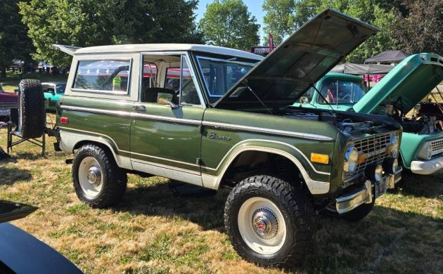 This Bronco’s interior is a case of “something old, something new.” The carpet, dashpad, and paint all look fresh. The seller confirms that we can add the instrument cluster and wiring to the list, along with air conditioning from the folks at Classic Auto. I can also spot an aftermarket stereo and a timber wheel that doesn’t float my boat. The Green cloth and vinyl seatcovers show some wear, although there aren’t gaping holes or other problems. With the rest of the interior looking so nice, I would be tempted to splash the cash on new covers and seat foam to provide a more “complete” appearance.
